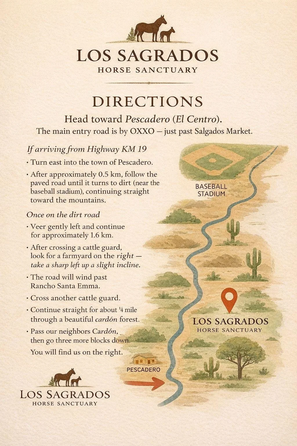 Travel 1.6 km on the dirt road, look for a farm yard with tractors and turn sharp left on a slight incline. Pass Rancho Santa Emma, go over a cattle grid, enter the Cardone Forest, and continue for 1.6 km and Los Sagrados is on the right.